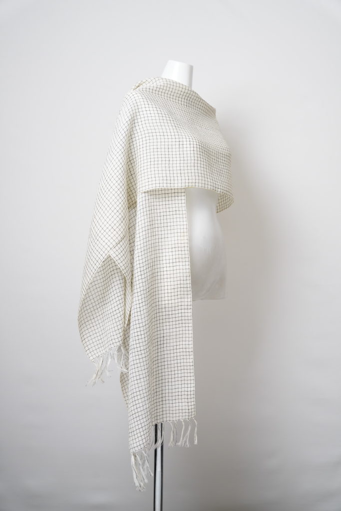 「目を閉じることと暗闇は違うのか」他の上布アイテムと同素材同密度、同じ製法の無地の生地。織り手の技量が剥き出しとなる生機と、仕事を尽くした上布の先染めの無地、作り手其々の中にある答えを問われる布。